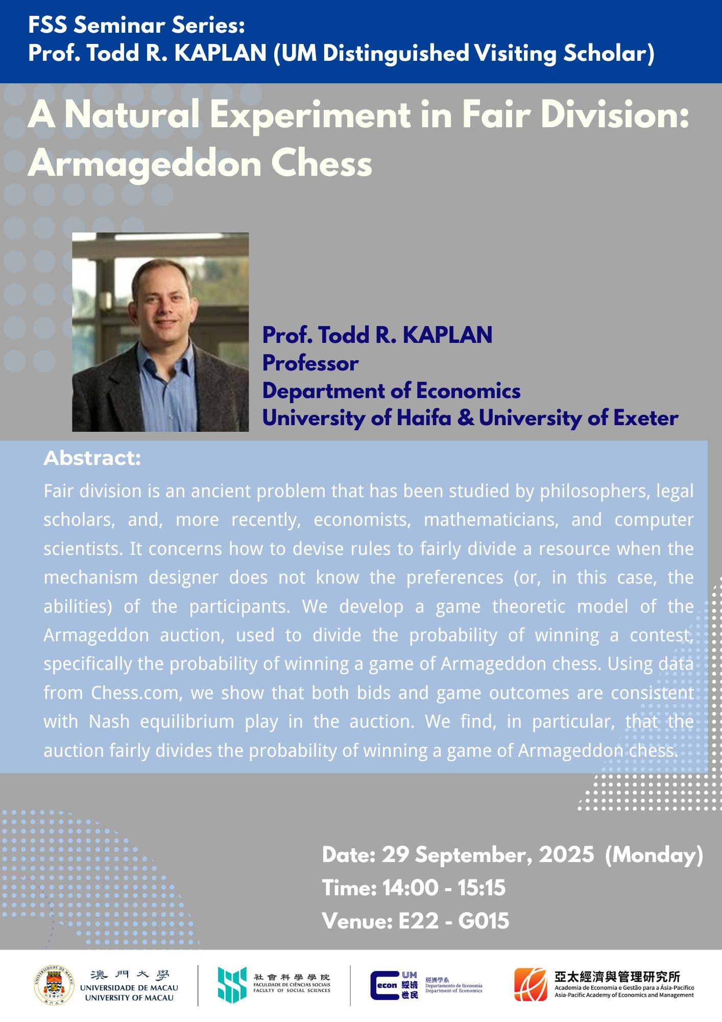 社會科學學院講座 (澳大傑出訪問學者): A Natural Experiment in Fair Division: Armageddon Chess 講者: Todd R. KAPLAN教授/英國 ...