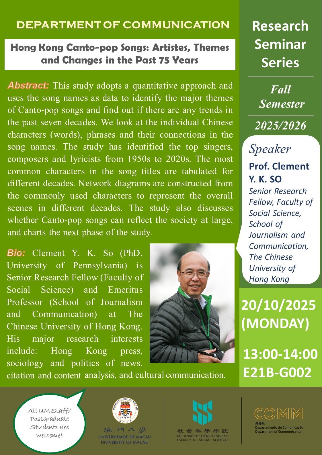 傳播系講座: Hong Kong Canto-pop Songs: Artistes, Themes and Changes in the Past 75 Years 講者: 蘇鑰機教授/香港中文大 ...