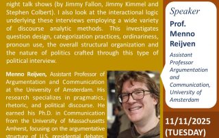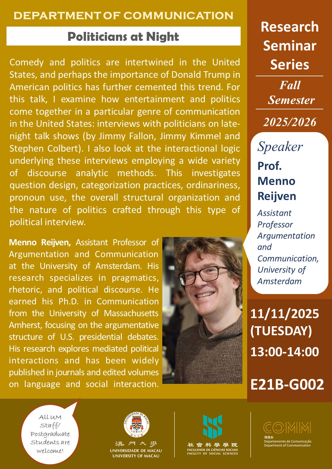 傳播系講座: Politicians at Night 講者: Menno H. Reijvan教授/阿姆斯特丹大學人文學院論證與傳播助理教授 日期:11/11/2025 (二) 時間:13:00 – ...