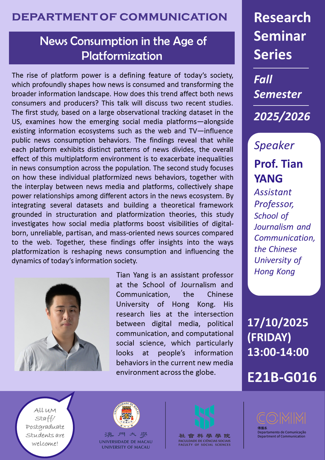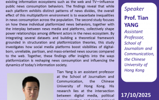 傳播系講座: News Consumption in the Age of Platformization 講者: 楊天教授/香港中文大學新聞與傳播學院助理教授 日期:17/10/2025 (五) 時 ...