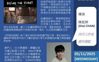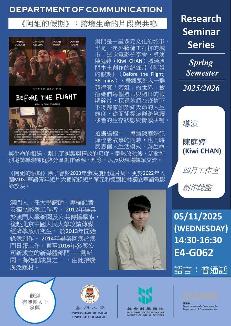 傳播系講座: 《阿姐的假期》:跨境生命的片段與共鳴 講者: 陳庭婷導演/四月工作室創作總監 日期:05/11/2025 (三) 時間:14:30 – 16:30 地點: E4-G062 語言: 普通 ...
