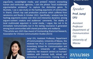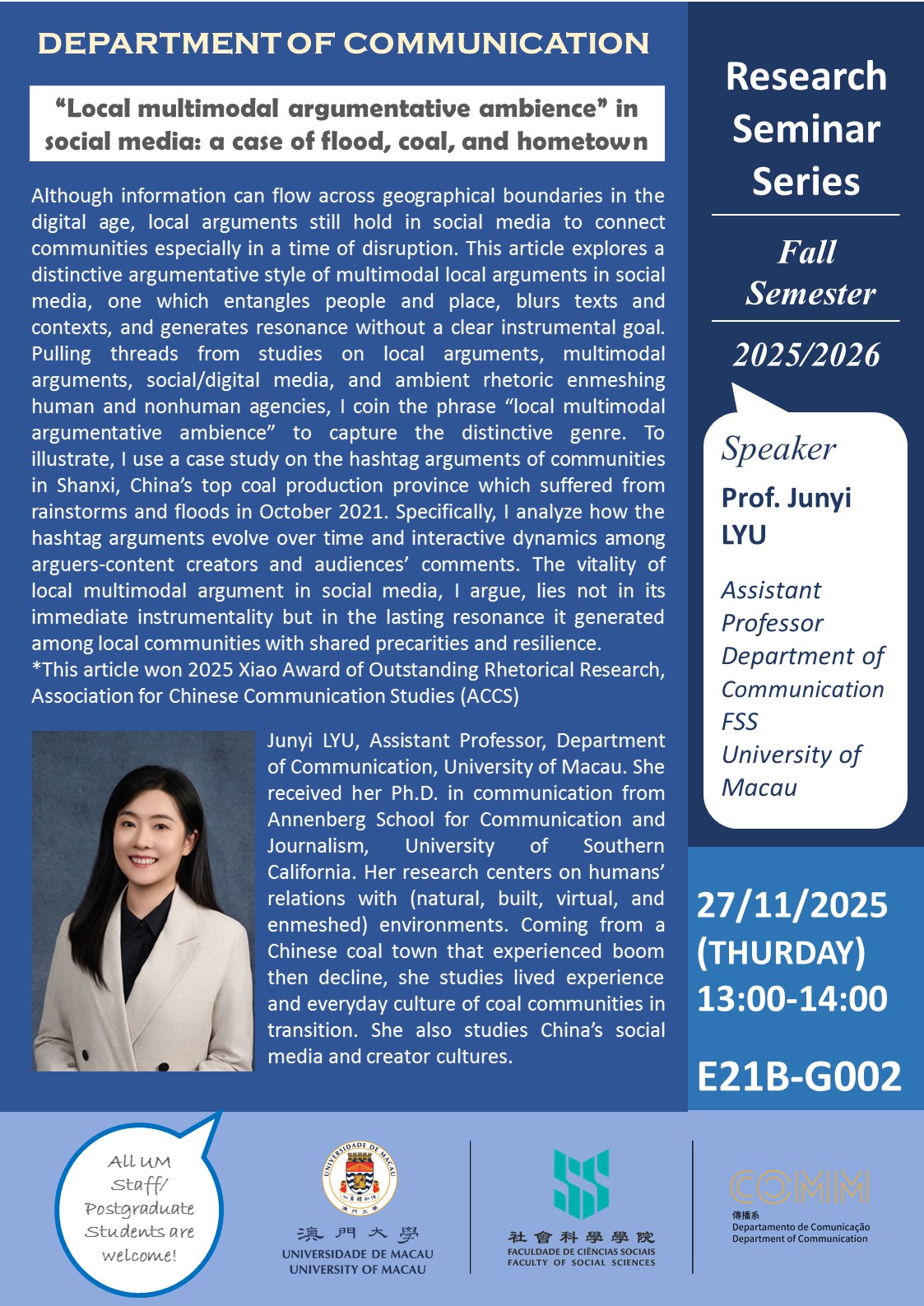 傳播系講座: Local multimodal argumentative ambience 講者: 呂珺昳教授/澳大社會科學學院傳播系助理教授 日期:20/11/2025 (四) 時間:13:00 ...