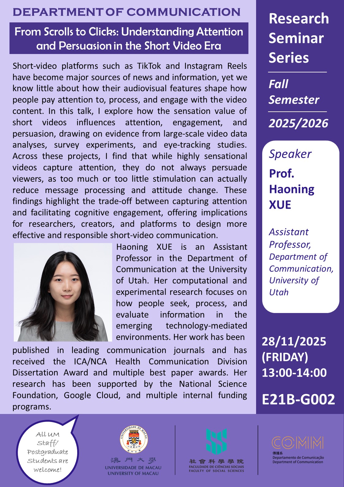 傳播系講座: From Scrolls to Clicks: Understanding Attention and Persuasion in the Short Video Era 講者: 薛灝 ...