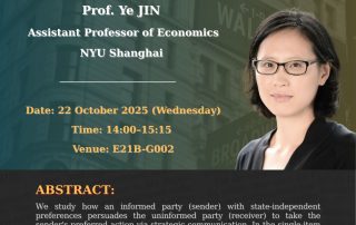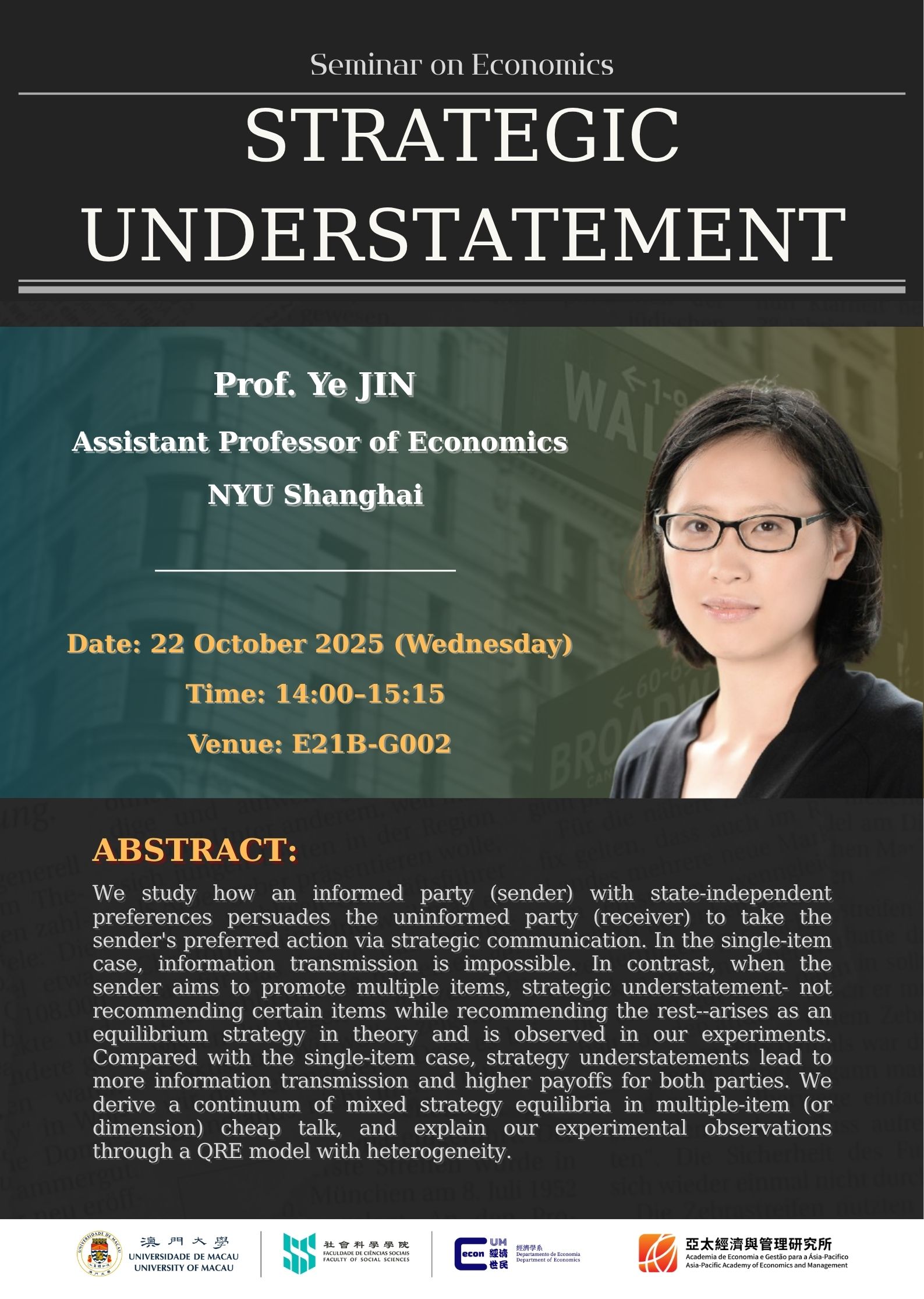經濟學系講座: Strategic Understatement 講者: 金燁教授/上海紐約大學經濟學助理教授 時間: 14:00-15:15 語言: 英語 地點: E21B-G002 內容: We ...
