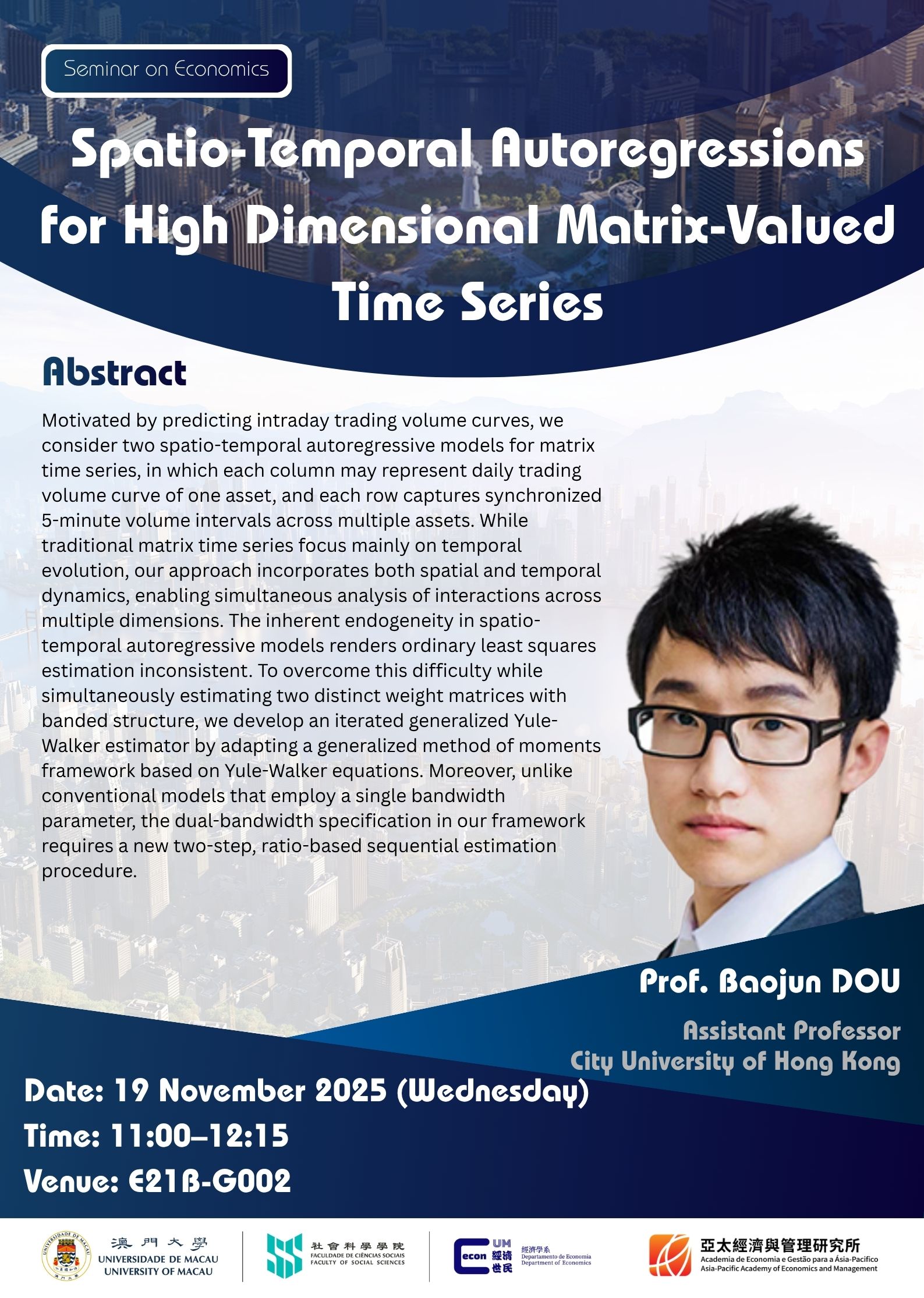 經濟學系講座: Spatio-Temporal Autoregressions for High Dimensional Matrix-Valued Time Series 講者: 竇寶君教授/香港 ...