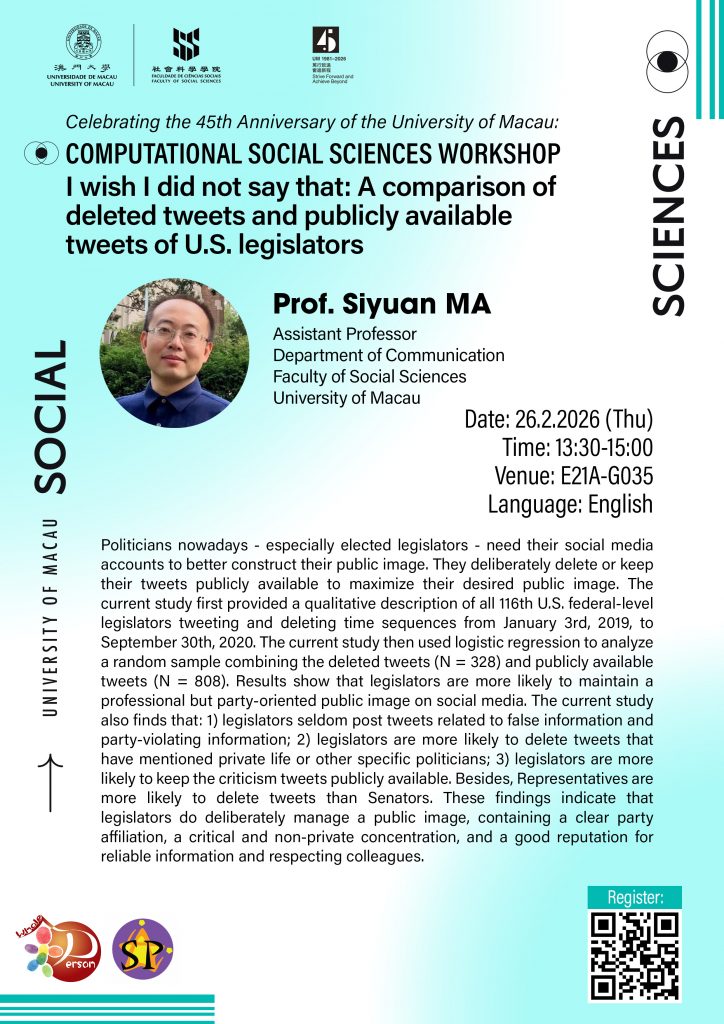 eddiekou Kou Man Kit2026-01-30T16:47:49+08:00 計算社會科學工作坊: I wish I did not say that: A comparison of deleted tweets and publicly available tweets of U.S. legislators 講者:馬思源教授/澳門大學社會科學學院傳播系助理教授 日期:26/02/2026 (四) 時間:13:30 – 15:00 地點:E21A-G035 語言:英語 報名:https://isw.um.edu.mo/evmapp/register/css_siyuanma26