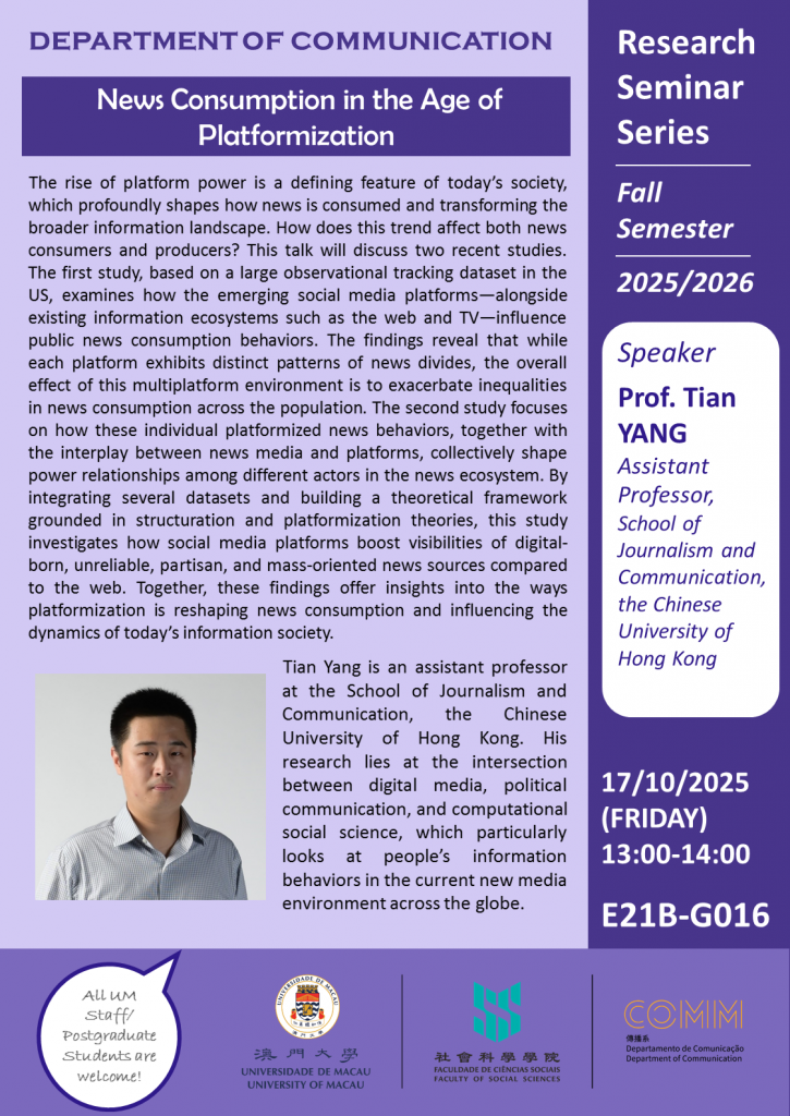 講者: 楊天教授/香港中文大學新聞與傳播學院助理教授