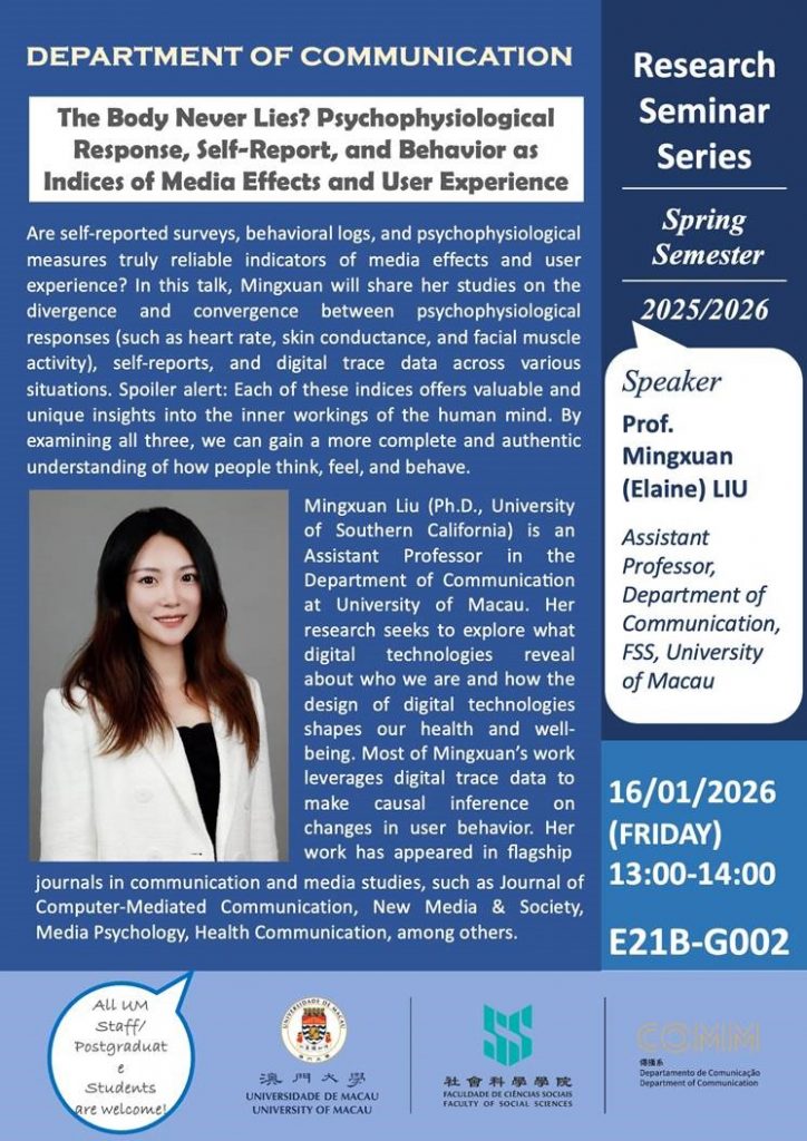 Speaker: Prof. Mingxuan LIU, Assistant Professor, Department of Communication, FSS, University of Macau