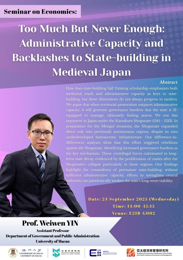 經濟學系講座: Too Much But Never Enough: Administrative Capacity and Backlashes to State-building in Medieval Japan