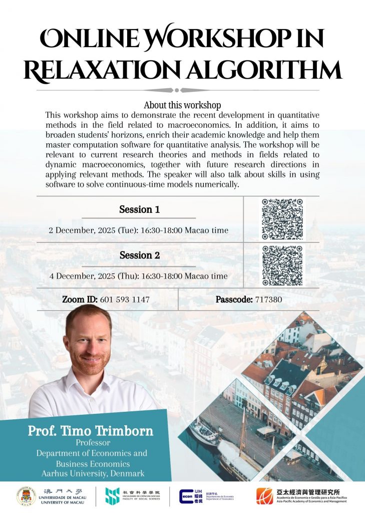 內容: It aims to demonstrate the recent development in quantitative methods in the field related to macroeconomics. In addition, it aims to broaden students’ horizons, enrich their academic knowledge and help them master computation software for quantitative analysis. The workshop will be relevant to current research theories and methods in fields related to dynamic macroeconomics, together with future research directions in applying relevant methods. The speaker will also talk about skills in using software to solve continuous-time models numerically.