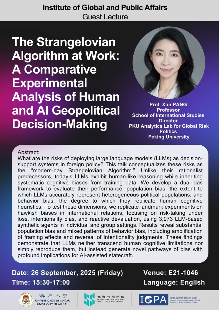 全球與公共事務研究所講座: The Strangelovian Algorithm at Work: A Comparative Experimental Analysis of Human and AI Geopolitical Decision-Making